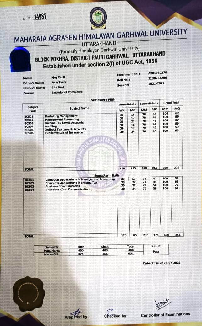 | Exam | Full Marks | Pass Marks | Marks Obtained |