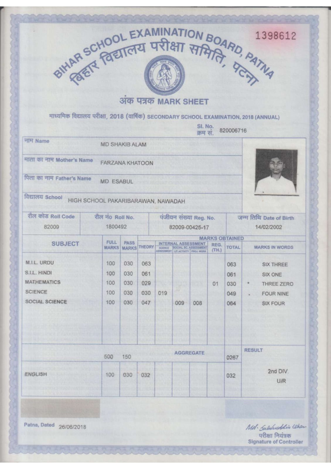 | Exam | Full Marks | Pass Marks | Marks Obtained |