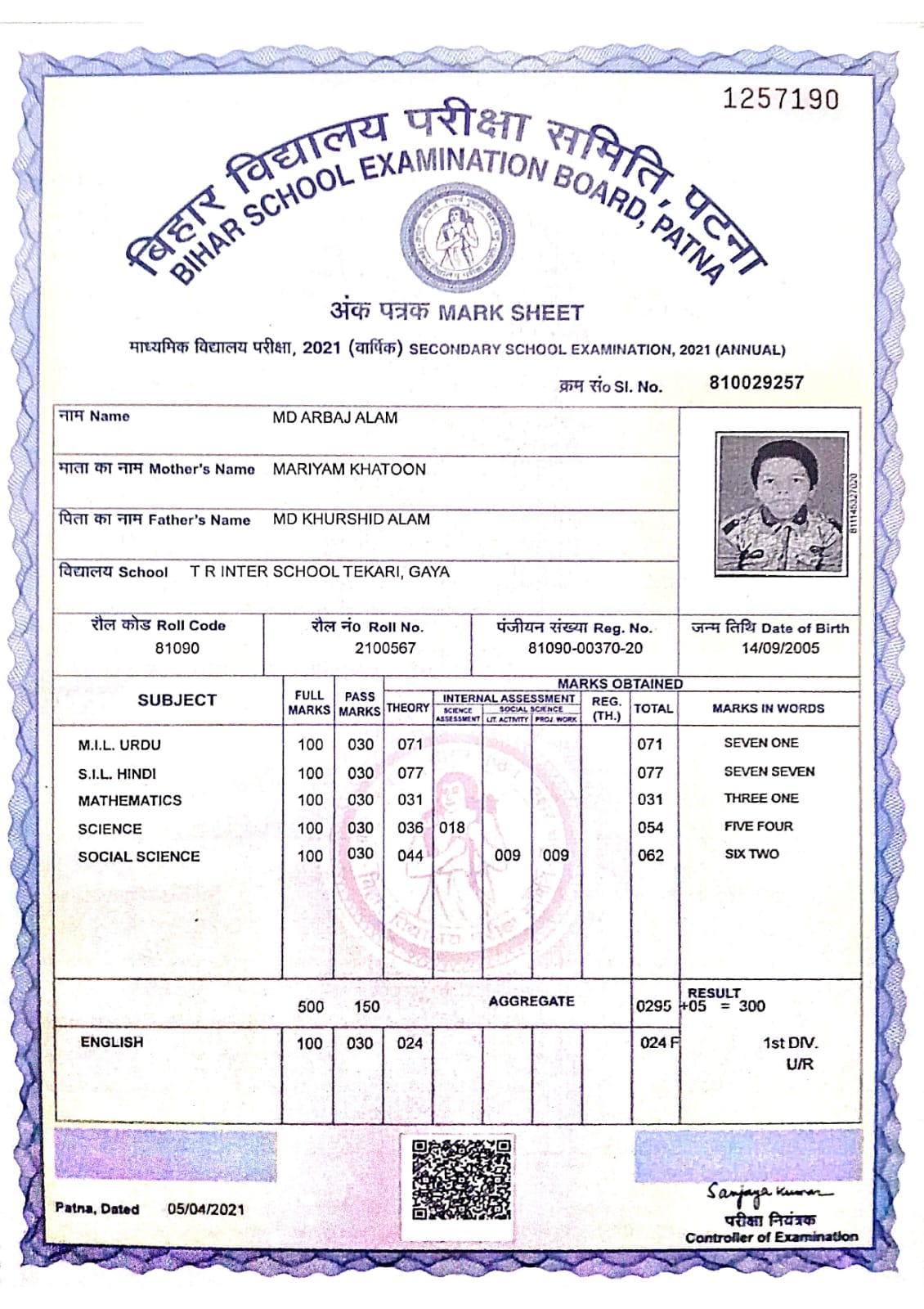 | Exam | Full Marks | Pass Marks | Marks Obtained |