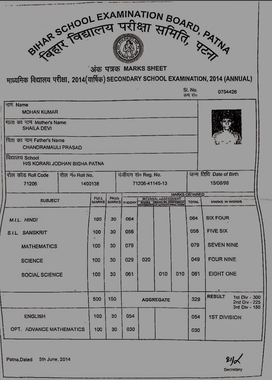 | Exam | Full Marks | Pass Marks | Marks Obtained |