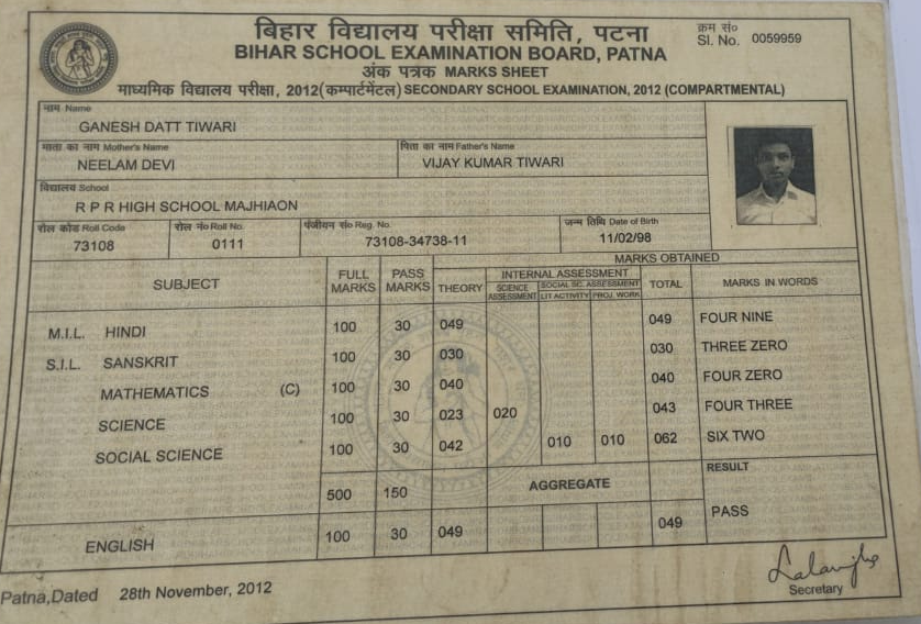 | Exam | Full Marks | Pass Marks | Marks Obtained |