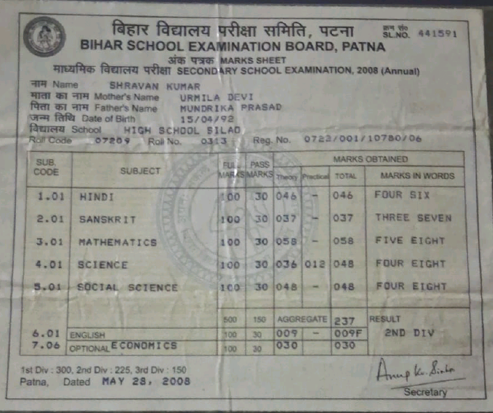 | Exam | Full Marks | Pass Marks | Marks Obtained |