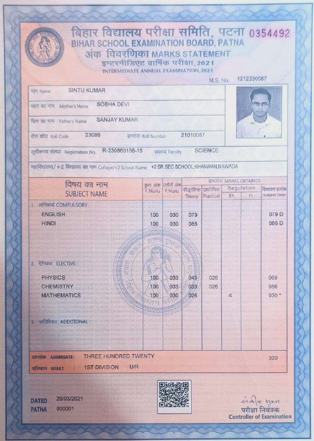| Exam | Full Marks | Pass Marks | Marks Obtained |