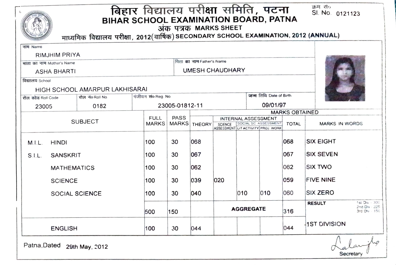 | Exam | Full Marks | Pass Marks | Marks Obtained |